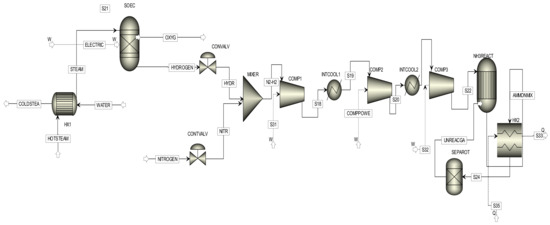 Numerous studies have assessed the viability of producing ammonia and green hydrogen from an economic and environmental perspective. In order to produce hydrogen and ammonia, Tukenmez et al. [5] assessed solar and biomass-powered systems. Pozo et al. [6] examined two green electricity and blue ammonia production facilities from an economic perspective and suggested two low and zero-carbon emission systems for ammonia synthesis. Eco-friendly ammonia synthesis using hydroelectric electricity and alkaline electrolyzers was studied by Rivarolo et al. [7]. According to the findings, the price of ammonia was less than EUR 400 per ton, which is comparable to the cost of traditional fossil fuel-based plants that produce ammonia. Ikaheimo et al. [8] proposed a novel means of combining district heating, electricity, and long-term energy storage with power-to-ammonia technology. The suggested system could be a cost-effective alternative if the price of natural gas surpasses EUR 70/MW·h. or the carbon tax exceeds EUR 200/ton CO2. A thermodynamic analysis of a new solar and wind-powered hydrogen generation device was carried out by Sorgulu and Dincer [9]. However, by electrolyzing water, high-temperature solid-oxide electrolysis (SOEC) can be used to store renewable energy in the form of hydrogen and oxygen. In addition to having greater electrical efficiency than low-temperature electrolysis technologies, SOEC makes it possible to integrate heat into the downstream synthesis process.