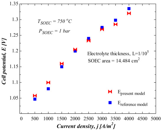 This section presents the model validation of SOEC in the present study using the published literature [13] and the results obtained by the simulation and analysis. The cell potential values at various current densities at an operating temperature of 750 °C and the other input parameters indicated in the graph are compared in Figure 3. The data’s reliability is demonstrated by an R2 value of 0.9758. The correctness of our model is demonstrated by the very good fit between the model results and the reference study.