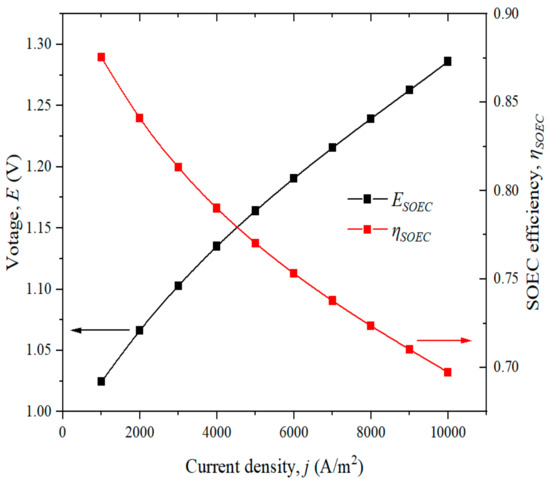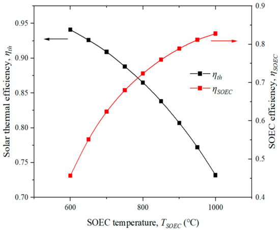 Figure 4 shows the variation in the SOEC temperature from 600 °C to 100 °C and its impact on the SOEC and solar thermal efficiencies. It can be seen that the solar thermal efficiency decreases, while the SOEC efficiency increase. The increase in the of ηSTF is because of a higher SOEC efficiency, which is boosted by a higher operating temperature. The decrease in the solar thermal efficiency is due to the irreversibility at higher surface temperatures and re-radiation loss, which play a crucial role in reducing the efficiency. Moreover, Figure 5 depicts the effect of the current density (J) on the cell voltage and SOEC efficiencies. The current density is a key factor that affects the cell voltage and SOEC efficiency. Cell voltage is the combination of four potentials (Nernst potential, activation, ohmic and concentration polarization). As the activation, ohmic and concentration polarization increase with the current density, the cell voltage of the SOEC is increased. However, the SOEC efficiency monotonically decreases with a rise in the current density, indicating that the energy loss caused by polarization plays a significant role in deteriorating the SOEC efficiency.