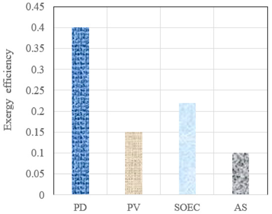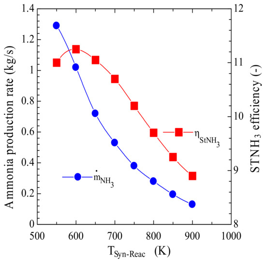 The impact of the synthesis reaction temperature on the ammonia production rate and solar-to-ammonia efficiency is plotted in Figure 6. This shows that increasing the reaction temperature to between 550 K and 900 K reduces the conversion rate, which has a negative impact on the generated ammonia and fuel efficiency. The ammonia production rate is decreased from 1.3 kg/s to 0.13 kg/s, while the solar-to-ammonia efficiency reduces to approximately 23.59%. This is due to catalyst deactivation at higher temperatures, which lowers the ammonia production rate. In addition, a higher temperature leads to irreversibility, causing more heat loss that will further decrease the efficiency. In addition, Figure 7 shows that the exergy efficiency of the solar dish collector is considerably higher (40%) than the other sub-systems of the proposed cycle, followed by the SOEC system (22%). The lowest exergy efficiency is observed in the ammonia synthesis unit, and is almost 10%.