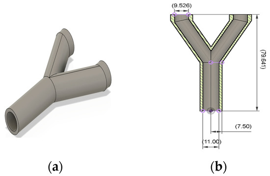 Design of the Y-shaped nozzle: (a) 3D model of Y-shaped nozzle; (b) cross-sectional view of Y-shaped nozzle.