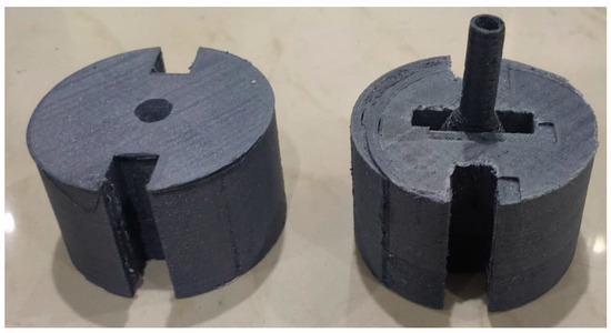The fixtures for securing the nozzles during the AFM process were also printed with ABS material to maintain consistency in thermal expansion properties. These fixtures were designed to hold the nozzles firmly in place, providing a secure pathway for the abrasive medium to flow through without causing deformation to the printed parts.