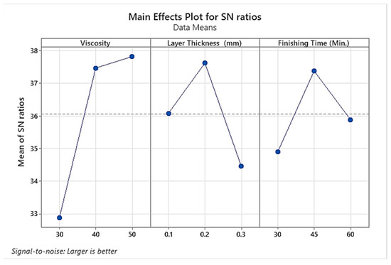 The main effects plot for S/N ratios indicates that the optimal viscosity setting for the AFM process is at 40, where the mean S/N ratio is at its peak, suggesting the highest quality output. The layer thickness of 0.2 mm is identified as the ideal value, as it corresponds to the highest mean S/N ratio, denoting superior surface finish. For finishing time, 45 min is the optimal duration, as it maximizes the mean S/N ratio, beyond which no quality improvement is observed, as shown in Figure 5.