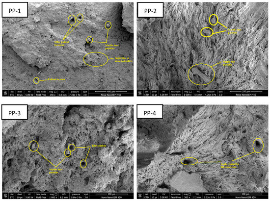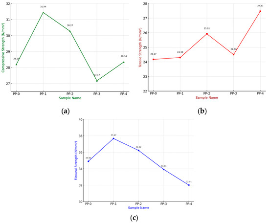 The trend for compressive strength is somewhat like flexural strength. There is abnormal behavior at PP-3. In the compression and tensile test, the load is axial in direction. Therefore, it can be said that both showed similar behavior for PP-3, as shown in Figure 2b. The compressive strength mainly depends on the void fraction and the adhesion between the PP and MD. Also, it can be observed by SEM images that the filler particulates are irregular in shape. With the increase in filler proportion, the chances of an increase in the agglomeration of particles increase the chances of failure.