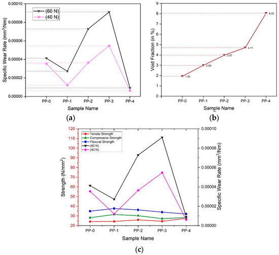 From Figure 3b, it can be seen that as the filler materials are increased, the void fraction increases. For PP-0 samples, the void fraction is estimated to be less than 1%. These void fractions help in explaining other mechanical and tribological analyses. From PP-1 to PP-2, there is an increase of 32.77% in the void fraction. From PP-2 to PP-3, there is an increase of 18.63%, whereas, after 3 wt% of filler material, there is an increase of 70.91%. A rapid rise in voids can be seen. Figure 3c represents all strengths and specific wear rates of the composite samples. Table 1 shows the specific wear rate of composite specimens at 40 N and 60 N load and void fraction.
