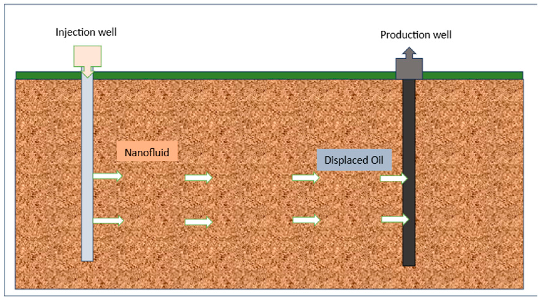 2]. The process consists of injecting the nanofluid with the injection fluid through the well, where it acts upon the rock surface, changing the oil-wet rock surface into a fluid-wet surface and thus displacing the oil through the pores until it reaches the production well, where more trapped oil is recovered, as illustrated in