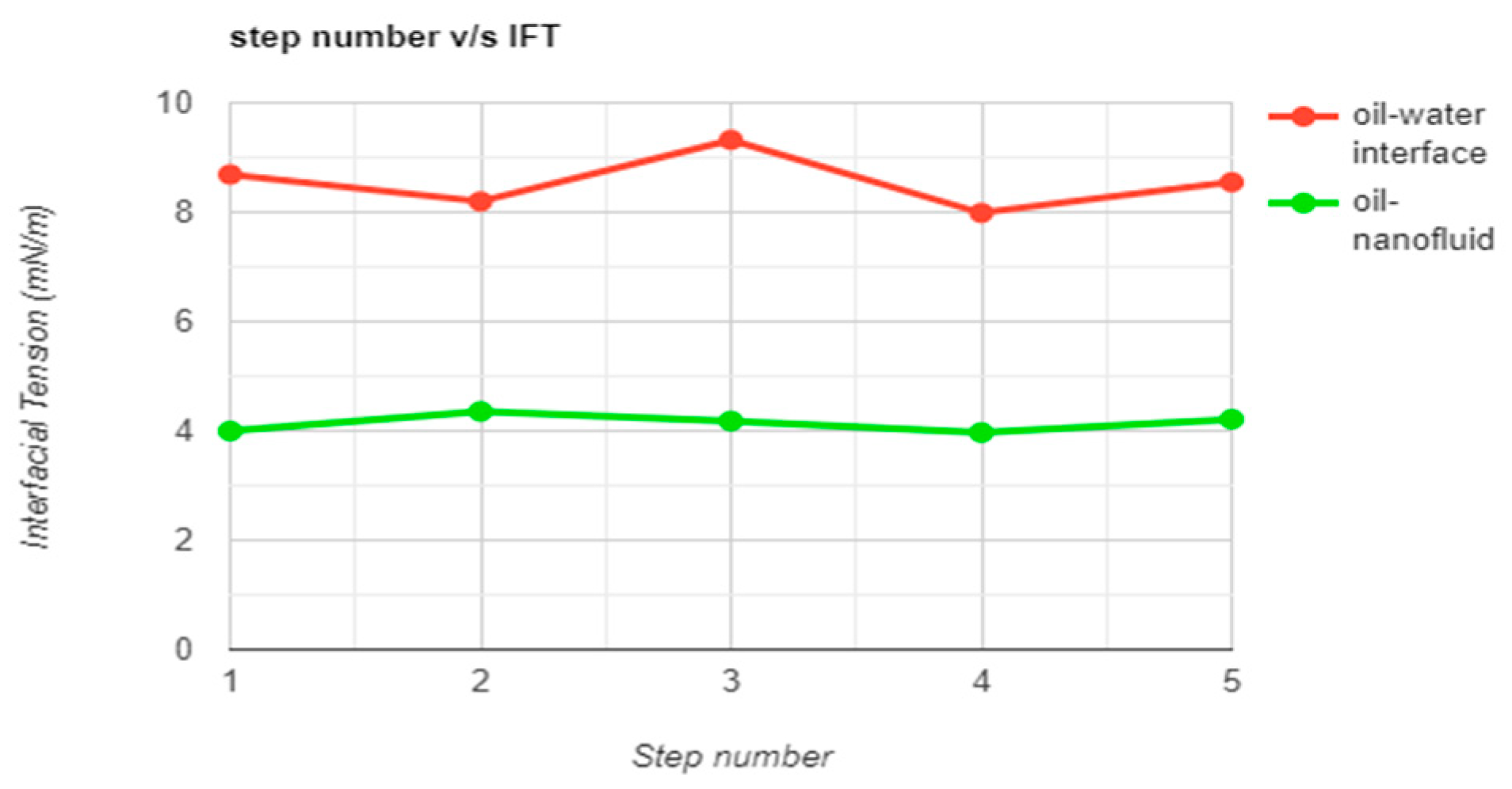 The interfacial tension measurements show that the IFT values for the oil–water interface range from 7.98574 to 9.32274 mN/m and the oil–nanofluid interface values from 3.69080 to 4.355481 mN/m. From the above data shown in