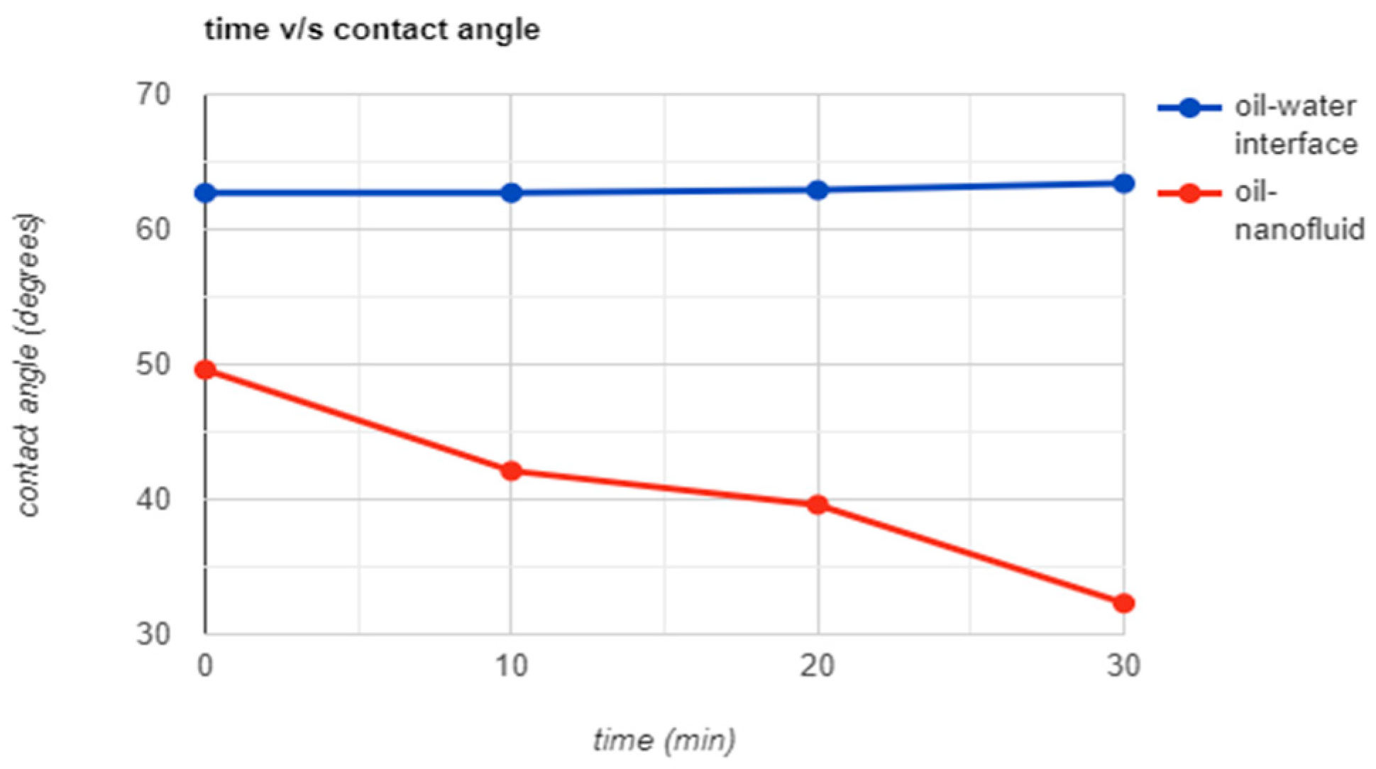 From the above contact angle analysis, it is clear that the contact angle is altered drastically with dropping silica nanofluid, similar to nanofluid injection in reservoirs; thus, the sandstone surface changes its wettability from oil-wet to fluid-wet, resulting in the mobilization of oil more efficiently.