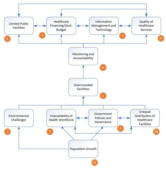 Several challenging factors were found from the literature review. These factors were discussed with experts in order to obtain a pairwise relation matrix. In this study, the following eleven challenging factors are considered: Limited Public Facilities (X1), Overcrowded Facilities (X2), Healthcare Financing/Govt. Budget (X3), Information Management and Technology (X4), Unavailability of the Health Workforce (X5), Quality of Healthcare Services (X6), Environmental Challenges (X7), Monitoring and Accountability (X8), Government Policies and Governance (X9), Unequal Distribution of Healthcare Facilities (X10), and Population Growth (X11).