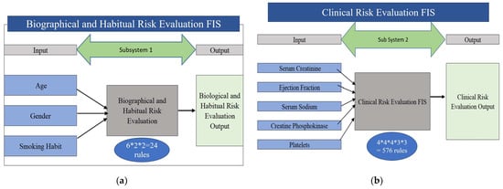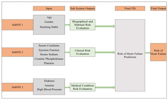 Figure 3. In this comprehensive system, a total of 125 fuzzy rules are applied. The output MFs categorize heart failure risk as ‘Low’, ‘Medium’, or ‘High’. Notably, the Clinical Risk Evaluation Output is the most influential among the three subsystems due to its critical inputs for heart health assessment [