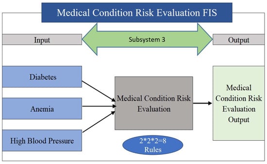 The Medical Condition Risk Evaluation FIS, a component of the Fuzzy Inference System, uses Diabetes, Anemia, and High Blood Pressure as inputs to assess medical risks. Each input has two membership functions, ‘Yes’ and ‘No’, indicating the presence or absence of these conditions. Utilizing triangular membership functions, this subsystem is structured to efficiently process medical data. It operates on 8 fuzzy rules. The block diagram of this subsystem is illustrated in