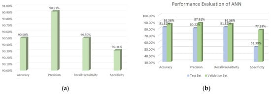 The ANN model is constructed using a total of 221 datasets, of which 80% have been randomly assigned to the training phase, 10% to the validation phase, and the remaining 10% to the testing phase. The validation and testing datasets are used to evaluate the performance of the established ANN model. The MSE, accuracy, precision, sensitivity, and specificity for the 90.00% testing and validation dataset are 16.17%, 81.82%, 80.22%, 81.82%, 52.30%, and 12.29%, 86.36%, 87.91%, 86.36%, and 77.53%, respectively.