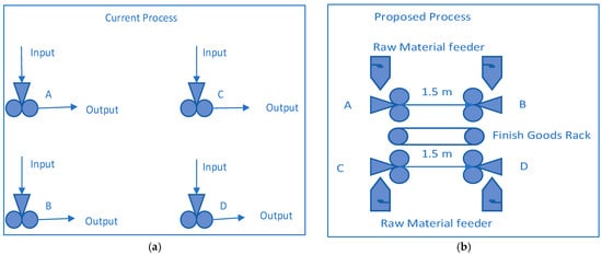 Table 1 indicates the assembly process and standard time associated with each process. It was observed that joining the back part of the stockings takes more time than joining the front. The production line has four machines that are used for the manual assembly of the stockings. In the current process, each machine receives semi-assemblies from the knitting process, and they have to assemble and close the leggings to finalize the process. This process takes 235 s for one stocking to be assembled manually, as shown in Figure 2a. Raw material flows into each machine and the operator joins the front and the back and places it on a finished goods rack next to the machine. This process is problematic because one operator might be busy while the others are idle because they have finished their tasks. To resolve this issue, a new process flow is proposed called an improved production line, where the machines face each other, and the operator divides the process into two as depicted in Figure 2b. This would enable a balanced workload and eliminate waste in the system.