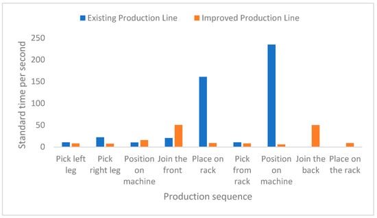 The proposed production flow line balancing process yielded significant results. The application of this process resulted in an improvement in the manufacturing process, and the production output increased from 1300 leggings per day to 2000 leggings per day, with the same number of machines and operators. This signifies a capacity improvement of 65%. In terms of actual production after the implementation of the layout redesign, the line’s daily production output was increased by 700 leggings per day. The line balancing process saved 71.3 s in every complete cycle of operation. The existing production line that normally produces 1300 leggings, using four machines and 14 workers, can now produce 2000 leggings with the same resources. The modification policies implemented in the Corsete Manufacturing company have successfully improved the operation performance of the production of leggings on the shop floor. The comparison of existing and improved production lines is depicted in Figure 3, indicating the enormous waste reduction against time and an increase in production output. An improved production layout was significant for waste reduction and productivity enhancement in the manufacturing plant, as shown in Table 3. For instance, modifying the sequence of operation, as shown in Figure 2a, has a significant time reduction in the “position on machine” operation and the placing of the “leggings on the rack” from 235 to 5.8 s and 168.8 to 9 s, respectively, as depicted in Figure 3. Again, line efficiency increased from 75.76% in the existing process flow to 81.20% in the improved process flow. This shows the relevance of optimizing the manufacturing process in the clothing industry. The cycle time for the workstations was reduced, through the modification of the machine layout, from 22.15 s per day to 14.34 s per day thus increasing the profit margin and overall performance of the manufacturing industries.
