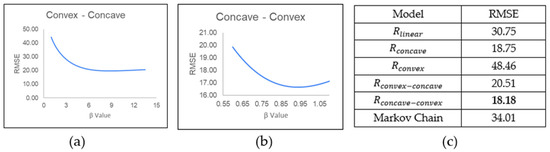 (a) The simulation of RMSE values for a range of β values for the convex–concave model, (b) the simulation of RMSE values for a range of β values for the concave–convex model, and (c) the RMSE values for the five models.