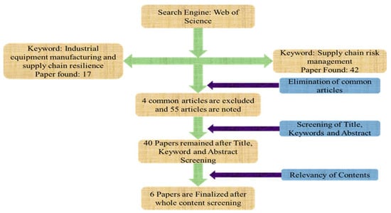 6]. To determine the most relevant literature, a comprehensive search was carried out in the Web of Science database. The keywords that we used for searching were “Industrial equipment manufacturing and supply chain resilience” and “supply chain risk management”. When we searched for “Industrial equipment manufacturing and supply chain resilience”, we found 17 articles, and we obtained 42 articles when we searched for “supply chain risk management”. Some articles appeared in both search results, and we found that this number was four. After we removed the common articles, we had a total of 55 articles.