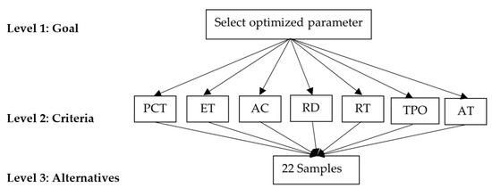 Step 1: Define the decision hierarchy by determining the decision problem’s main goal, criteria, and alternatives. They were categorized on three levels, and the hierarchical structure was created as shown in Figure 2 [13,14].