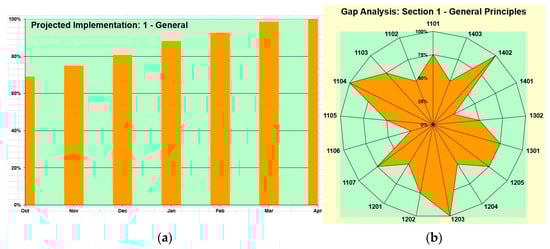 In addition to the spiderweb layout (Figure 3a), a Gantt chart was employed (Figure 3b) to visually depict the timeline for achieving 100% compliance with the WHO guidelines, with milestones and tasks organized chronologically. The Gantt chart serves as a dynamic planning tool, enabling stakeholders to adjust timelines and priorities as needed to optimize the compliance improvement process.