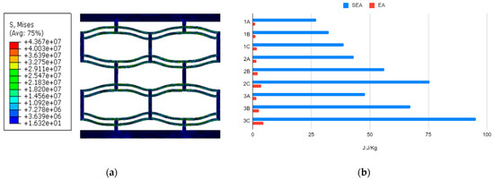 (a) Stress distribution of Model 1A; (b) energy absorption for Models 1A-3C.