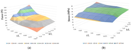 Since parametric values have a significant impact on the structural behavior, the energy absorbed, SEA, compressive stress, and threshold force were plotted against the parametric ratios of h/L and t/L. The ratio of h/L varied from 0.1 to 0.2, whereas the ratio was between 0.025 and 0.04 for the t/L. The surfaces shown in Figure 5 and Figure 6 demonstrate the influence of geometric parameters on various characteristics of NSHs.