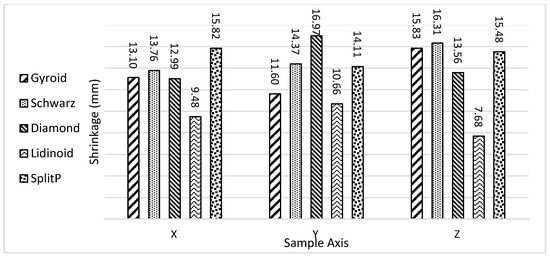 Figure 4. Post-sintering shrinkage in percentage for 0.5 mm shell thickness for each type of lattice.