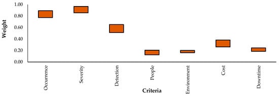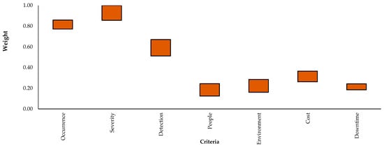 For both pieces of critical equipment, the rough FMEA’s criteria weights for severity (S), occurrence (O), detection (D), people (P), environment (E), repair cost (C), and downtime (T) are different, as shown in Figure 1 and Figure 2. The figures also display the decision-makers’ opinion distribution as a bar graph. The degree of uncertainty among the decision-makers is represented by the length of the bar. A shorter length of the spread represents increasing accuracy of the decision-makers’ opinions [8].