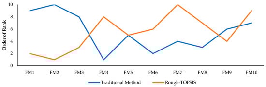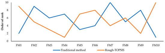 From the results shown in Table 2 and Table 3 and Figure 3 and Figure 4, it is observed the rankings of the traditional technique are very far apart from those of the suggested technique. For example, in Table 2 and Figure 3, FM4 (bearing failure), which ranked first in the suggested method, was ranked seventh in the traditional method, and FM10 (flange leakage), which ranked last in the suggested technique, was the most critical failure mode in the traditional method for a reciprocating pump. A variety of factors contributed to the disparity. A drawback of classic FMEA is that it uses the weighted mean approach to combine the evaluation values, which is flawed in real-world applications because it ignores the biasness of decision-makers and the uncertainty of evaluation data [9]. When dealing with subjective and ambiguous data, the suggested methods circumvent this by employing rough numbers, which could also aggregate various assessment values. The conventional technique, which does not take into account flawed data while making decisions, calculates the failure risk using precise figures.