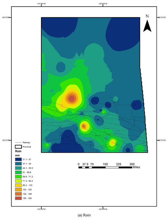 Figure 1a, the rain hotspot map, we can see that compared to minimum temperature and snow, the overall rain risk in the whole province appears to be less hazardous. However, in the southern regions, where populated cities and a railway network exist, the rain hazards are more significant than the snow hazards, especially in the south–central regions. The lowest risk in the northern province among the three factors studied is rain, which seems less hazardous in less populated regions.