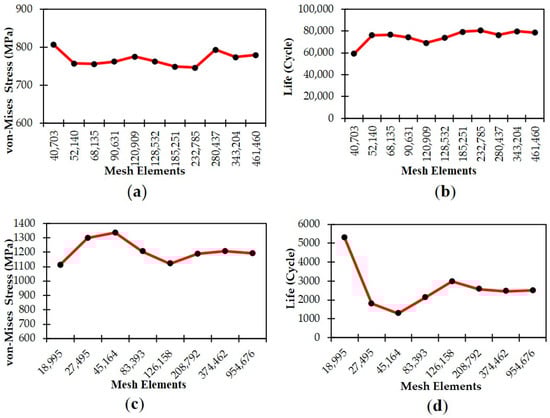 First, both harrow tines were subjected to mesh dependency tests to establish the mesh-independent bodies against the mesh element sizes. In continuum damage mechanics (CMD), mesh refinement does not always ensure accuracy as extreme refinement can cause spurious mesh sensitivity, which has a severe impact on predictions [18]. Figure 1 shows mesh-dependency plots of both harrow tines for both von Mises stress and life. In the mesh-dependency test with the skewness metric, the 0.62530” HT model converged at a 3.2 mm mesh size, resulting in 182,020 elements, whereas the 0.5260” HT model converged at a 3 mm mesh size, counting a total of 208,792 elements. The skewness mesh metric average was 0.4328–0.4569, which is close to the recommended guide [19] to rectify the mesh independence model’s accuracy.
