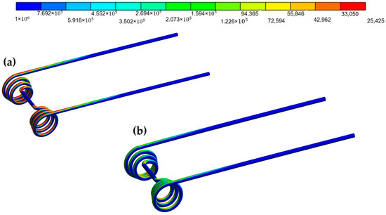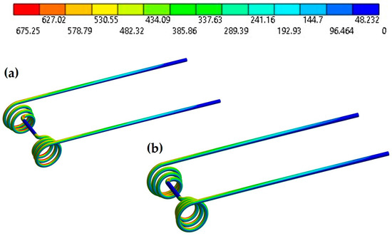 where = spring rate of torsional spring, = wire diameter, = coil’s inner dia., = number of active coils, and = shear modulus [21]. Though the effect of the wire diameter has no significance on the closed coil spring’s rate [22], the equational relation reveals that the influence of the wire diameter on the torsional spring rate is proportional. But Equation (2) is not straightforward for conical helical torsion springs used in harrow tines. Some other factors, such as pitch, spring free length, coil inner diameter, and pitch angle, overshadow the preferential effect of wire diameter. For instance, the number of active coils is determined by the axial pitch and effective spring height [23]. Conical helical springs demonstrated a higher load-bearing ability than conventional-designed helical springs for the same dimensions [24]. In this regard, 0.62530” HT and 0.526” HT are both made with double conical helical torsion springs, but their wire diameter, pitch, pitch angle, coil height, and coil inner diameter variations make their performance characteristics different. Nazir et al. [24] showed that helical springs offer the highest load-carrying capability with a higher wire diameter and lower pitch combination. However, anything beyond the optimal wire diameter accelerates energy loss, which affects the spring fatigue life. Consequently, a small coil height and wire diameter can improve the wear resistance of helical springs significantly. On the contrary, a large inner coil diameter contributes to wear resistance improvement, which is not as significant as a small coil height and small wire diameter [25]. For example, 0.62530” HT made with 0.625 inches of wire has an outer coil diameter of 4.5 inches and an inner coil diameter of 2.625 inches, maintaining 0.927 constant pitch, whereas 0.5 inches of wire made 0.526” HT offers 3.75 inches and 2.625 inches of outer and inner coil, respectively, following 0.77 pitch. As we know, a higher wire diameter offers higher stiffness for the helical torsion springs, so 0.62530” HT is supposed to provide a higher fatigue life experienced with lower stress. But for every deflection, 0.62530” HT showed a lower fatigue life compared with the 0.526” HT model. For instance, 0.526” HT showed better fatigue life than 0.62530” HT, even in 12-inch deflections, as shown in Figure 3a,b, respectively. This is because of the pitch, wire diameter, and coil height influences we discussed earlier. Though both models have three symmetrical coils, 0.526” HT’s coils seemed to be more compact to offer more active coil surfaces considering a small pitch angle of 13.67°. The coil height difference between the two models is not significant to compare. Again, 0.62530” HT offers 0.927 constant pitch between coils, which is higher compared with 0.77 from 0.526” HT.