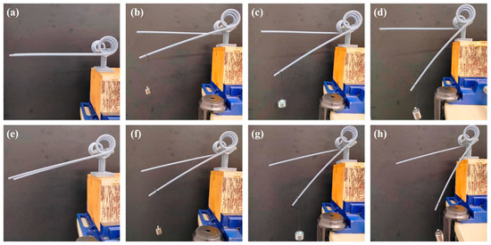 The 0.526” HT and 0.62530” HT prototype models underwent a load-bearing approach where deflections were measured for an identical load set (20, 50, and 100 gm). This experimental analysis was carried out for a comparative analysis between the models and to validate their performance characteristics under different deflections, as summarized in Table 2. A bracket system was fabricated where the harrow tine’s staple was fixed through screwing from both ends. Both side tightening schemes impede the staple’s distortion while applying the load on the legs, as represented in Figure 4a–h. Different dead weights were hung on the leg, and we measured the harrow tine deflections. Loads were consistently applied at a 1 mm distance from the leg end for all observations. The 0.62530” HT showed higher deflections for all weight loads compared with the 0.526” HT, which exhibited lower deflections. The same observation was examined in the FEM approach, maintaining the experimental framework. A similar trend is observed in the numerically derived results, as 0.526” HT exhibits higher stiffness against the definite loads shown in Figure 5. The effects of pitch, wire diameter, pitch angle, and coil height were analyzed in the previous section, which could influence the harrow tine stiffness.