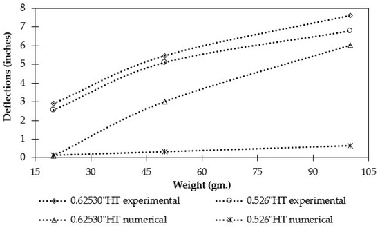 Again, larger legs from the 0.62530” HT model can increase the deflections more than the 0.526” HT, but springs made with large wire diameters generally show greater deflections, as observed in other research works [28,29]. For numerical validation, epoxy resin was selected for 35% of the prototype models instead of the material used in 3D printing. This is reflected in the deflection curves, where the numerical deflection curves showed lower values in all cases. This is because the required material property of the actual resin was missing. However, the results are still valid for comparative analysis and show actual trends that are similar from an experimental perspective.