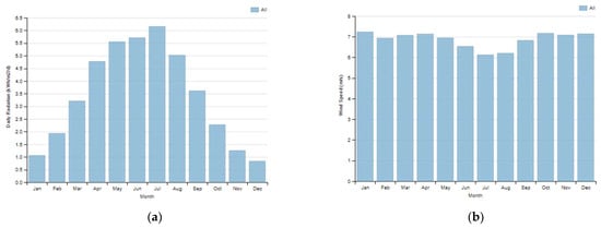 The location of the hypothetical irrigation project is Lake Diefenbaker, Saskatchewan. Not only is surrounding land considered suitable for irrigation, but the reservoir also reduces pumping requirements. Lake Diefenbaker is considered a probable location for irrigation development within the province. For each time step of the year, regional solar radiation and windspeed data (Figure 1) are selected from NASA’s surface meteorology and solar energy database using HOMER []. The database spans many years. HOMER presents these data as daily averages and synthesizes the data to an hourly resolution for analysis.