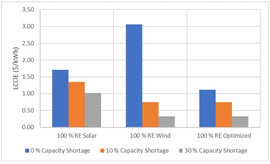 Though permitted capacity shortages can greatly reduce costs for any RE system, it must be noted that costs remain well above a grid connection (Table 5). Having said that, if an irrigation project is of sufficient quality, remote, and willing to permit large capacity shortages (of at least 30%), a 100% RE scenario may become competitive. Other studies have found hybrid RE systems as an electrification pathway for grid-disconnected communities, especially with the inclusion of demand side management techniques [] or effective dispatch strategies [].