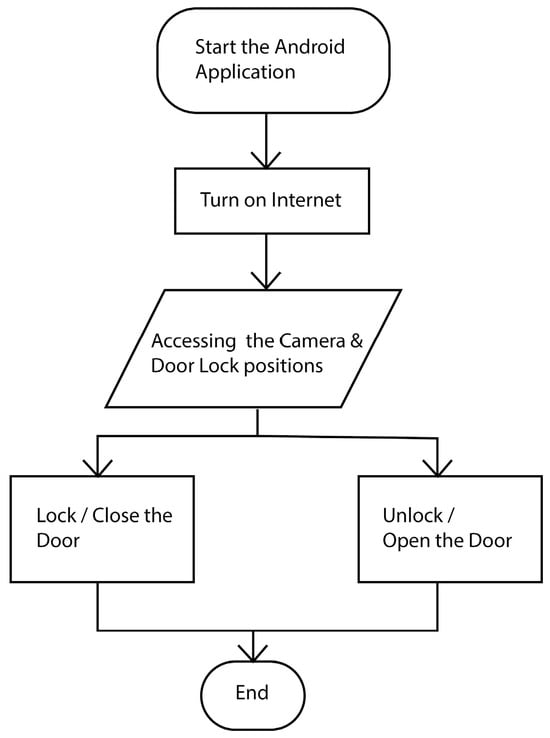In this project, the “IoT-based Smart Door Lock System using Android Application”, we proposed a door lock system that can be operated via an Android app on a smartphone. The user must initially launch the Blynk app version 1.2, which is linked to the door lock system. The Android Studio program runs the application. To monitor the status of the door and control it after launching the Blynk app, the user must enable the internet connection on his or her smartphone. It is a system for IoT access doors. Figure 1 represents the functioning flowchart of the Android application.