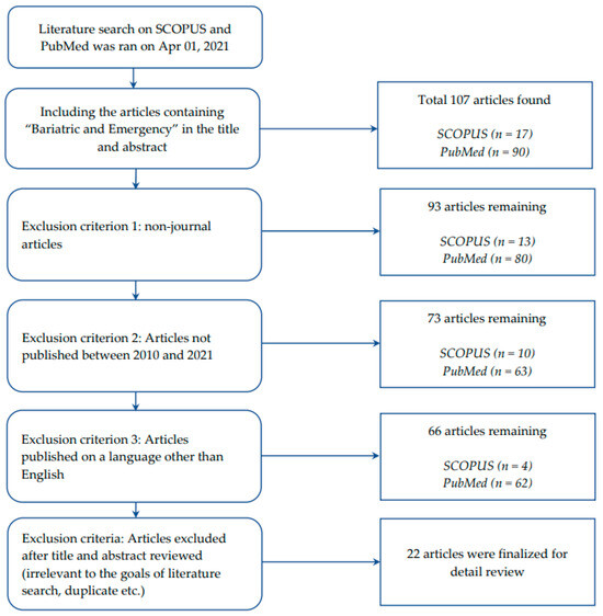 Initially, a search was conducted using the keywords “bariatric” and “emergency” in the title or abstract, resulting in a total of 107 articles. To narrow down the selection, the exclusion criterion was set to exclude articles that were not journal articles, reducing the count to 93. Another criterion was applied based on the publication timeline, excluding articles published before 2010 and up until the year 2021 (as of 1 April 2021). The rationale behind this criterion was that data prior to 2010 might be outdated due to the rapid advancements and transformations in bariatric surgery and data recording methods. This further reduced the list to 73 articles.