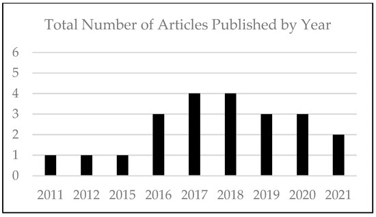 Of the 22 selected articles published, the majority of the articles were published between 2016 and 2020 (Figure 2). The number of preoperative, intraoperative, and postoperative factors found to significantly impact the probability of patients returning to the ER within 30 days following bariatric surgery varied across studies. The range of significant factors identified in each study ranged between one and eight. The majority of the studies (above 90%) examined had fewer than eight significant factors influencing postoperative ER visits within the 30-day timeframe.