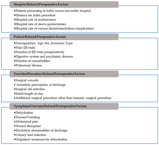 In summary, this systematic literature review highlights the multifaceted nature of bariatric surgery outcomes, influenced by various hospital-, patient-, provider-, and symptom-related factors. This comprehensive understanding provides a foundation for developing targeted interventions and optimizing the entire spectrum of bariatric surgery care, ultimately leading to improved patient outcomes and more efficient healthcare resource utilization. Further research and collaboration among healthcare stakeholders are essential to harness the potential benefits of these findings that mainly focus on preoperative factors that can be used to help predict the likelihood of patients presenting to the ER within 30 days of discharge after a bariatric surgery procedure. This study sought to integrate preoperative factors, suggesting a need for further exploration into how they intersect with intraoperative and postoperative factors to enhance understanding of patient care continuity, suggesting avenues for future research.