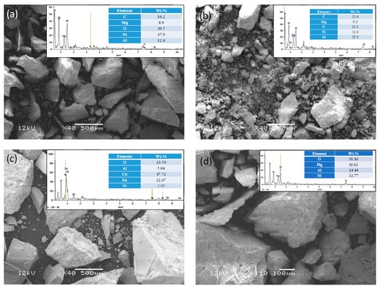 SEM-EDX images illustrating the morphology and compositions of the four commercial catalysts: (a) Ar-401, (b) NGPR-2, (c) MS-901, and (d) NG-608 L. The insets in the Figure illustrate the percentages of the elemental compositions.