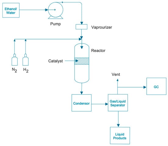 The steam reforming process was conducted in a fixed-bed reactor, as illustrated in Figure 3. Constructed from Inconel material capable of withstanding high temperatures, the reactor features external and internal diameters of 1.050” and 0.514”, respectively. Engineered with a thickness designed to withstand pressures exceeding 500 bar, the reactor was situated within an electric furnace. To regulate the flow rates, a Cisco pump delivered the ethanol/water mixture, while the temperature of the catalyst was monitored using a thermocouple inserted into the reactor. Before assessing the catalysts’ performance, a 500 mg sample placed at the center of the packed-bed reactor was reduced at 400 °C in 10% H2 for one hour. During the reaction, the ethanol/water mixture was vaporized in a preheater before entering the reactor. Subsequently, the reaction products were condensed in a condenser and passed through a gas–liquid separator, where the liquid products were collected for analysis, while the gaseous products were sampled for analysis using online gas chromatography.