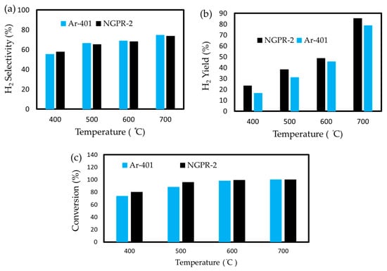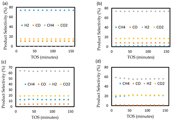 Furthermore, the product selectivities of the four catalysts were compared, as illustrated in Figure 4. In Figure 4a, Ar-401 had hydrogen, carbon dioxide, and carbon monoxide selectivities of 75% 15%, and 10%, respectively, with a negligible amount of less than 1% of CH4. The product selectivities of the NGPR-2 catalyst (Figure 4b) were similar to those of Ar-401.