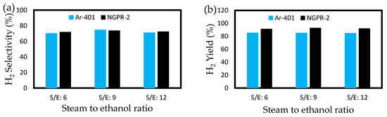 The impacts of the steam–ethanol ratio on the hydrogen selectivities and hydrogen yields of the Ar-401 and NGPR-2 catalysts were analyzed. It is important to note that the catalysts were tested under atmospheric pressure and at 700 °C. The evaluations were conducted at steam-to-ethanol ratios of six, nine, and twelve. For Ar-401, the hydrogen selectivities were 70.3%, 74.8%, and 71.1% for the steam-to-ethanol ratios of six, nine, and twelve, respectively. In comparison, NGPR-2 exhibited hydrogen selectivities of 69.8%, 72.6%, and 70.3% for the corresponding steam-to-ethanol ratios, as illustrated in Figure 5. Furthermore, the hydrogen yields of Ar-401 were 85.2%, 85.1%, and 84.8% for the steam-to-ethanol ratios of six, nine, and twelve, respectively. Meanwhile, the hydrogen yields of the NGPR-2 catalyst were recorded as 91.2%, 92.7%, and 91.9% for the steam-to-ethanol ratios of six, nine, and twelve, respectively. This reveals a consistent trend where both the catalysts exhibit similar hydrogen selectivities, but NGPR-2 shows a higher hydrogen yield. This observation is consistent with the higher nickel content in NGPR-2, providing more active sites for breaking the ethanol C-C bonds and catalyzing the reforming reaction to produce hydrogen. Furthermore, the selectivity of each catalyst increases with an increase in steam-to-ethanol ratio from six to nine, but decreases when further increased from nine to twelve. This suggests the competitive adsorption of steam at higher concentrations, occupying more active sites and leaving fewer sites for ethanol adsorption [10]. Therefore, there is no advantage in using more water in the ethanol steam reforming reaction beyond a steam-to-ethanol ratio of nine. Notably, both the Ar-401 and NGPR-2 catalysts achieved 100% ethanol conversion at all the three steam-to-ethanol ratios.