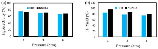 The influence of pressure on ethanol steam reforming was examined on the Ar-401 and NGPR-2 catalysts. Both the catalysts were assessed under identical conditions of 700 °C and a steam-to-ethanol ratio of nine. The pressure was systematically adjusted from atmospheric pressure to 3 bar, and finally to 6 bar. The recorded hydrogen selectivity and hydrogen yield at the different pressures are depicted in Figure 7.