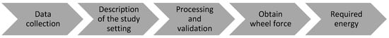 The calculation of the wheel force is the result of the sum of four forces that oppose movement: drag resistance, inertia resistance, rolling resistance, and slope resistance, which are part of the energy and power calculation of the vehicle. Consequently, energy and power calculation are part of the force of a vehicle [13,14].