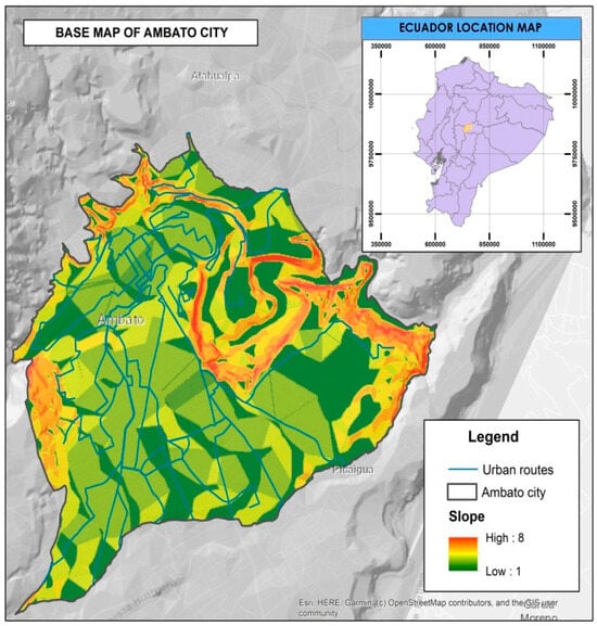 The morphology of Ambato has irregular slopes, which prevent urbanization and the generation of road infrastructure easily, as well as the passage of the Ambato River that crosses the city transversely, sectoring it into different platforms [10]. Figure 2 shows the distribution of slopes and existing urban transport routes.