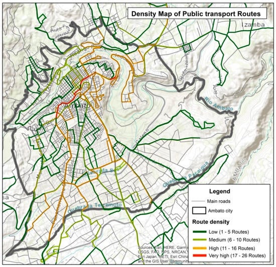 The data regarding routes and operating frequencies were obtained from the transit and transportation administration of the city of Ambato, based on their contracts with private urban bus companies. This information is detailed in Table 4 and illustrated through the public transport route density map in Figure 3 [15].