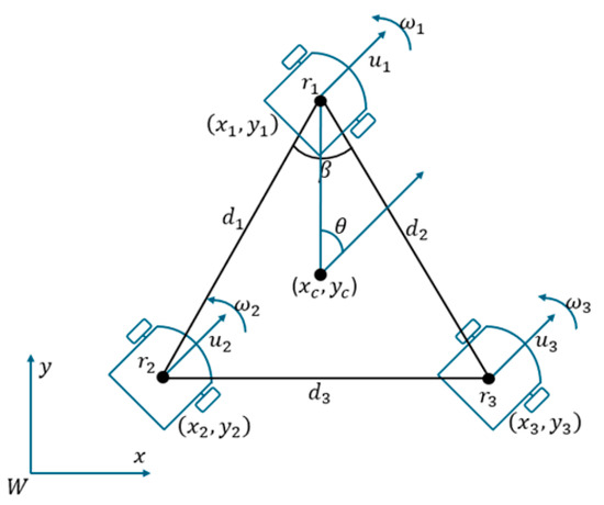 where are the variations of the robot positions in the formation; are the velocities of the robots in the formation; and is the Jacobian of the rotational arrays for the three-robot system. To determine the model in formation variables [19], the geometry or shape of the formation is described by and the posture geometry is given by , mathematically defined in (3).
