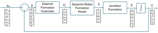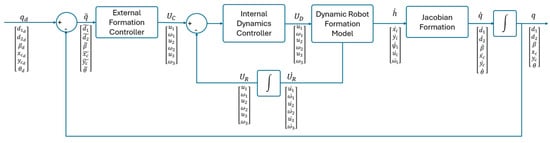 This section details the five different cascade controllers that were developed. The outer controller is responsible for managing the formation, while the inner controller handles the robot’s dynamic compensation. The developed controllers are (i) PD formation controller without dynamic compensation (PD); (ii) SMC formation controller without dynamic compensation; (iii) PD formation controller with dynamic compensation (PD-DI); (iv) PD formation controller with dynamic sliding mode control (PD-SMCV); and (v) sliding mode formation control with dynamic sliding mode dynamic compensation (SMC-SMCV). Figure 2 shows the control diagram without dynamic compensation, which includes only the outer controller scheme. This scheme is used for the PD and SMC formation controllers. Additionally, Figure 3 shows the control diagram for both formation and dynamic compensation control, using a cascade controller configuration. This scheme is employed by the PD-DI, PD-SMCV, and SMC-SMCV controllers.