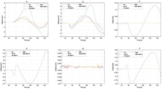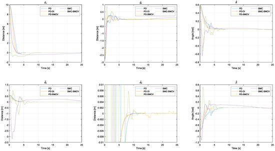 This experiment had a duration of 50 s. Figure 4 shows the pose and shape errors. Analyzing the results, the controller with the best performance (faster stabilization) was the PD-SMCV controller, which implemented PD formation control and SMC dynamic compensation. It can also be observed that controllers with SMC formation control exhibited oscillatory and abrupt variations in error, resulting in longer settling times.