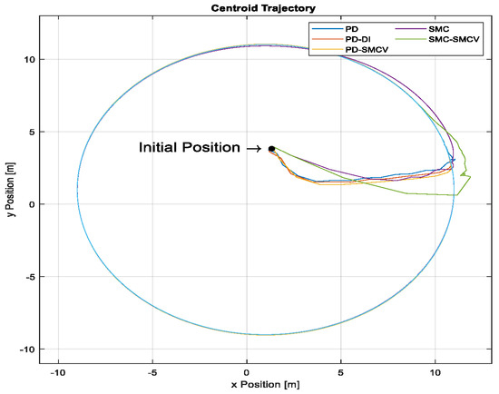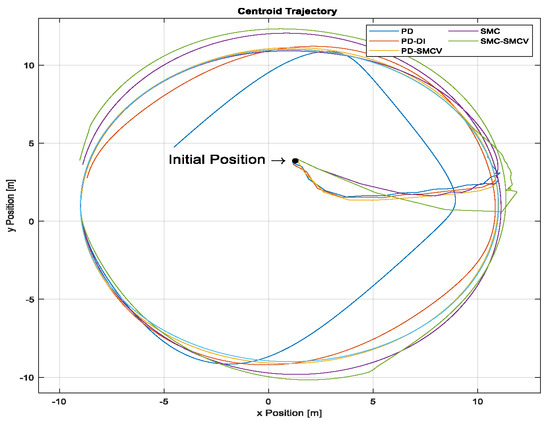 Figure 6 shows the formation errors. In this experiment, it can be observed that the PD-SMCV controller resulted in lower errors and faster settling times, indicating that this controller better corrected the dynamic perturbations of the system compared to the other controllers, which exhibited higher errors. The PD-SMCV controller presented errors of less than 0.5 m for the centroid positions, while the PD controller, which lacked dynamic compensation, resulted in errors greater than 6 [m] for the centroid position. In contrast, the PD-DI, SMC, and SMC-SMCV controllers presented errors of less than 2 m. Additionally, it can be observed that controllers implementing the SMC formation control exhibited significantly higher errors and oscillations in the formation variables , and . Figure 7 shows the centroid formation trajectory. It is observed that most of the controllers exhibited a significant deviation between the path followed and the reference, except for the PD-SMCV controller, which effectively corrected the disturbance and aligned closely with the reference.